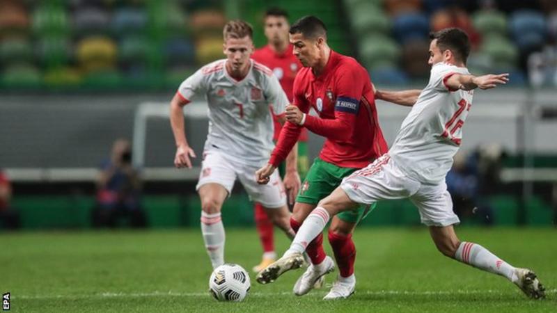 وكان المنتخب الاسباني الطرف الافضل في الشوط الاول وكان الأخطر فرصاً، خصوصاً عبر مهاجمه جيرارد مورينو، فيما بدا تأثر أصحاب الأرض بغياب برونو فرنانديش ودييغو جوتا وجواو فيليكس وبرناردو سيلفا ووليام كارفاليو.