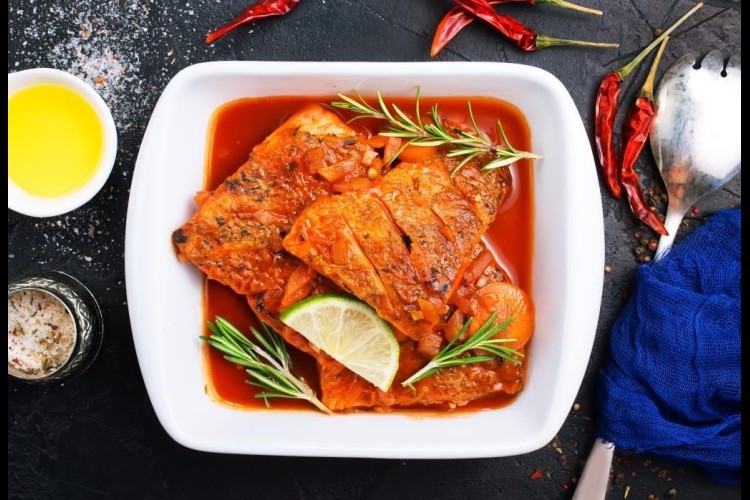 - ضعي قطع السمك المقلي في الصلصة برفق، وغطي القدر، واتركي السمك يسخن في الصلصة لبضع دقائق حتى يتشرب النكهات.