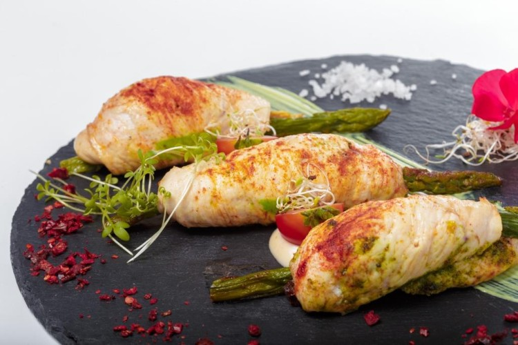 - ضعي الدجاج بالهليون والجبنة في طبق التقديم، وقدميه ساخناً.