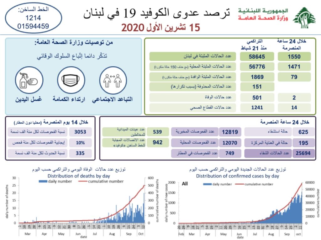 سجل عداد كورونا اليوم 1550 إصابة جديدة وحالتا وفاة