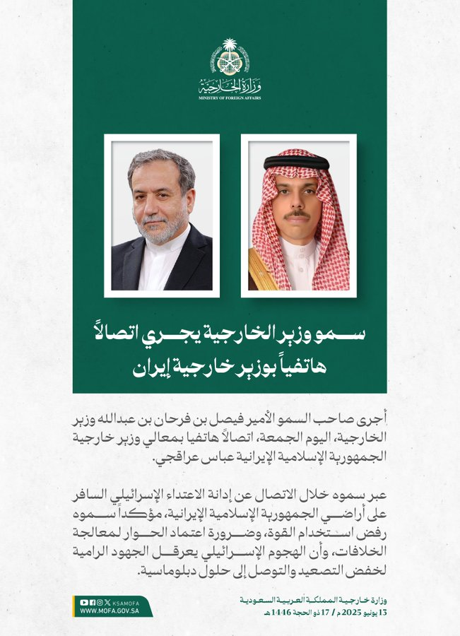 كما أجرى وزير الخارجية السعودي الأمير فيصل بن فرحان اتصالاً هاتفياً بوزير الخارجية الإيراني عباس عراقجي، الجمعة، حيث أكد على أن هجوم إسرائيل على إيران يعرقل جهود خفض التصعيد.