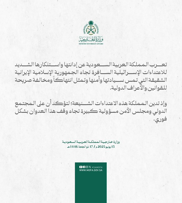 “تعرب المملكة العربية السعودية عن إدانتها واستنكارها الشديد للاعتداءات الإسرائيلية السافرة تجاه الجمهورية الإسلامية الإيرانية الشقيقة التي تمس سيادتها وأمنها وتمثل انتهاكاً ومخالفة صريحة للقوانين والأعراف الدولية.
