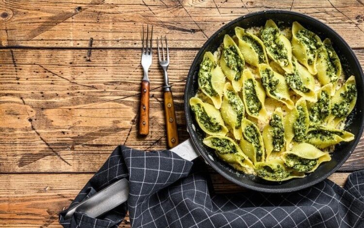 - احشي أصداف المكرونة بحشوة السبانخ، ثم رصّيها في صينية فرن.