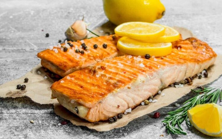 - ضعي شرائح السلمون في صينية فرن، ثم وزعي صلصة الزبدة والثوم والليمون على الشرائح بالتساوي.